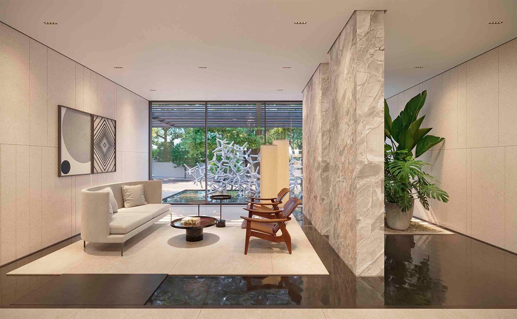 PORTARIA RESIDENCIAL COM ESCULTURA EXCLUSIVA ASSINADA POR PIERO LISSONI
