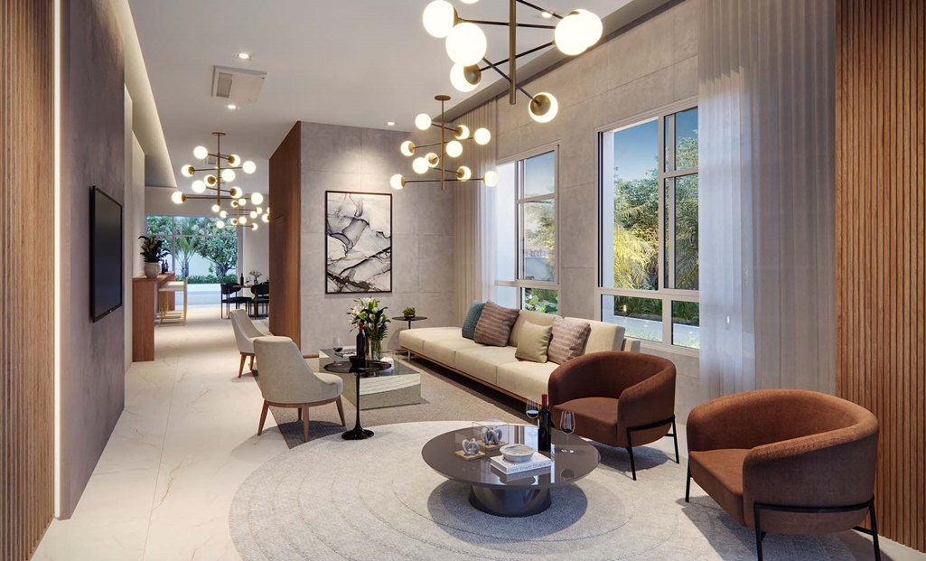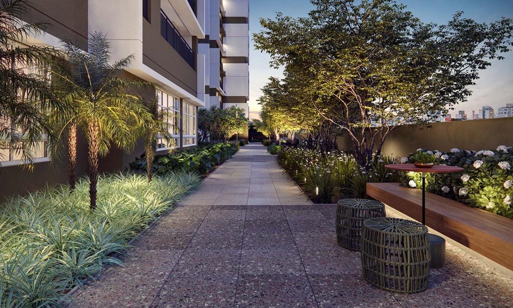 LOBBY DE CHEGADA. DESIGN E PAISAGISMO PERMEIAM POR TODAS AS ÁREAS COMUNS VALORIZANDO O AR PURO E O CONTATO COM A NATUREZA