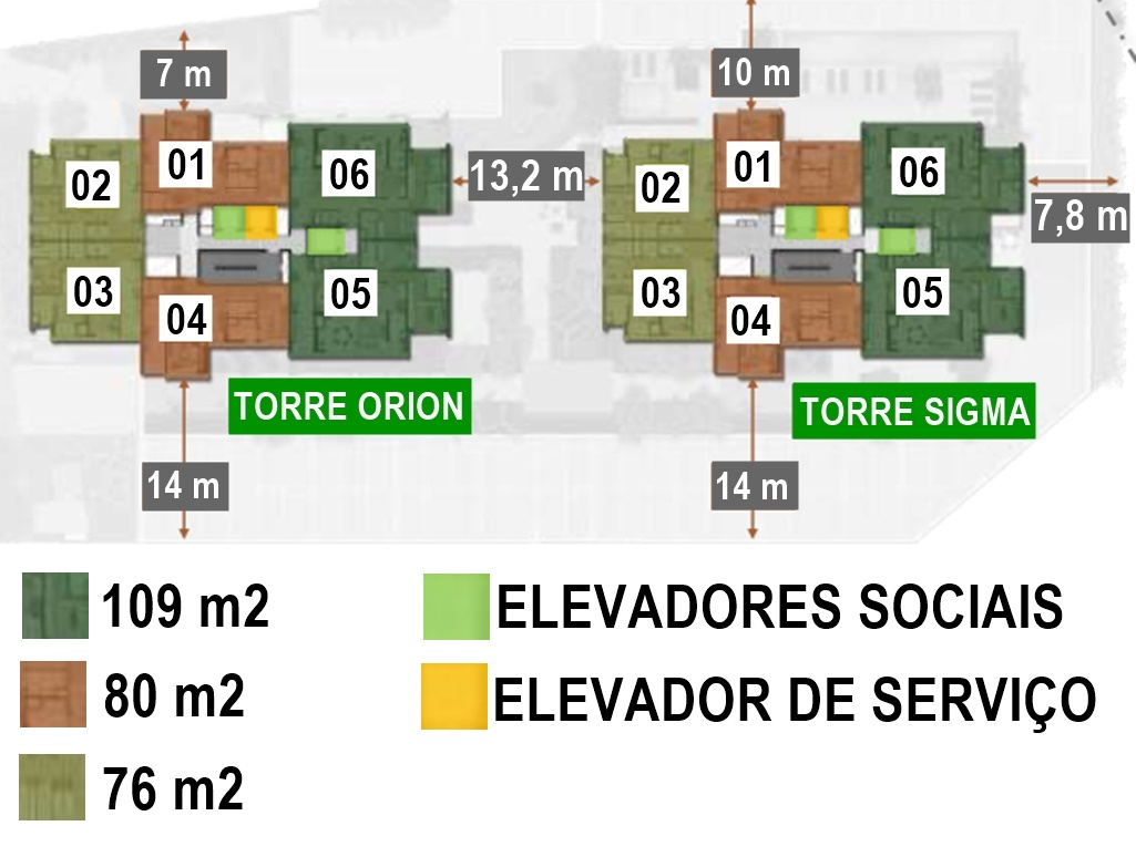 AS DUAS TORRES GÊMEAS (ORION E SIGMA), COM APARTAMENTOS EXCLUSIVAMENTE RESIDENCIAIS COM AS MESMAS DIMENSÕES EM AMBAS TORRES, FORAM PROJETADAS PARA OFERECER SEGURANÇA, LAZER E CONFORTO.
