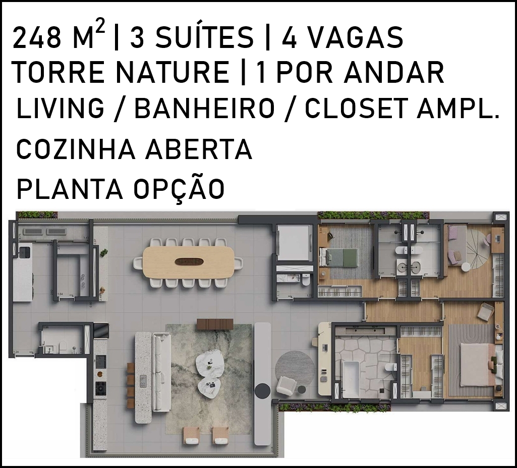 SUGESTÃO DE DECORAÇÃO PARA O LIVING AMPLIADO DO APARTAMENTO DE 248 M2