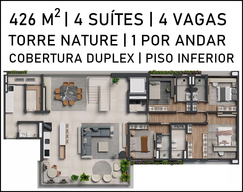 VOO DE PÁSSARO DO PISO INFERIOR E SUPERIOR DA COBERTURA DUPLEX DE 426 M2 COM SUGESTÃO DE DECORAÇÃO