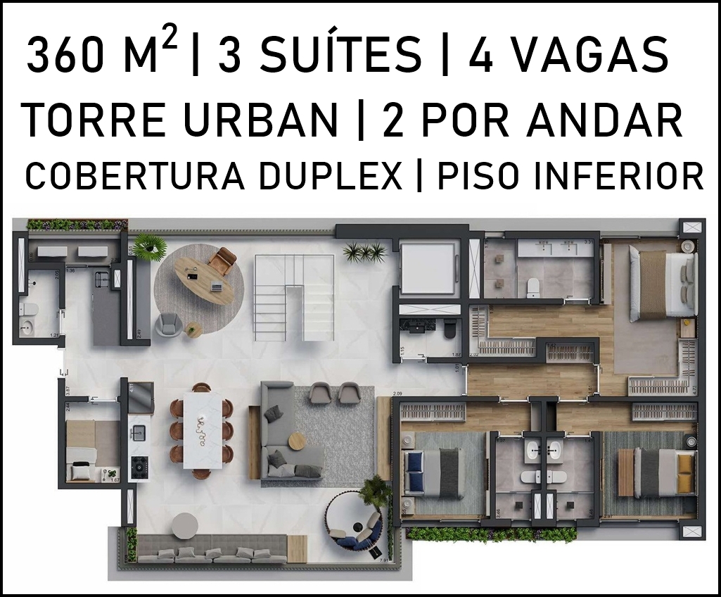 VOO DE PÁSSARO DO PISO INFERIOR E SUPERIOR DA COBERTURA DUPLEX DE 360 M2 COM SUGESTÃO DE DECORAÇÃO