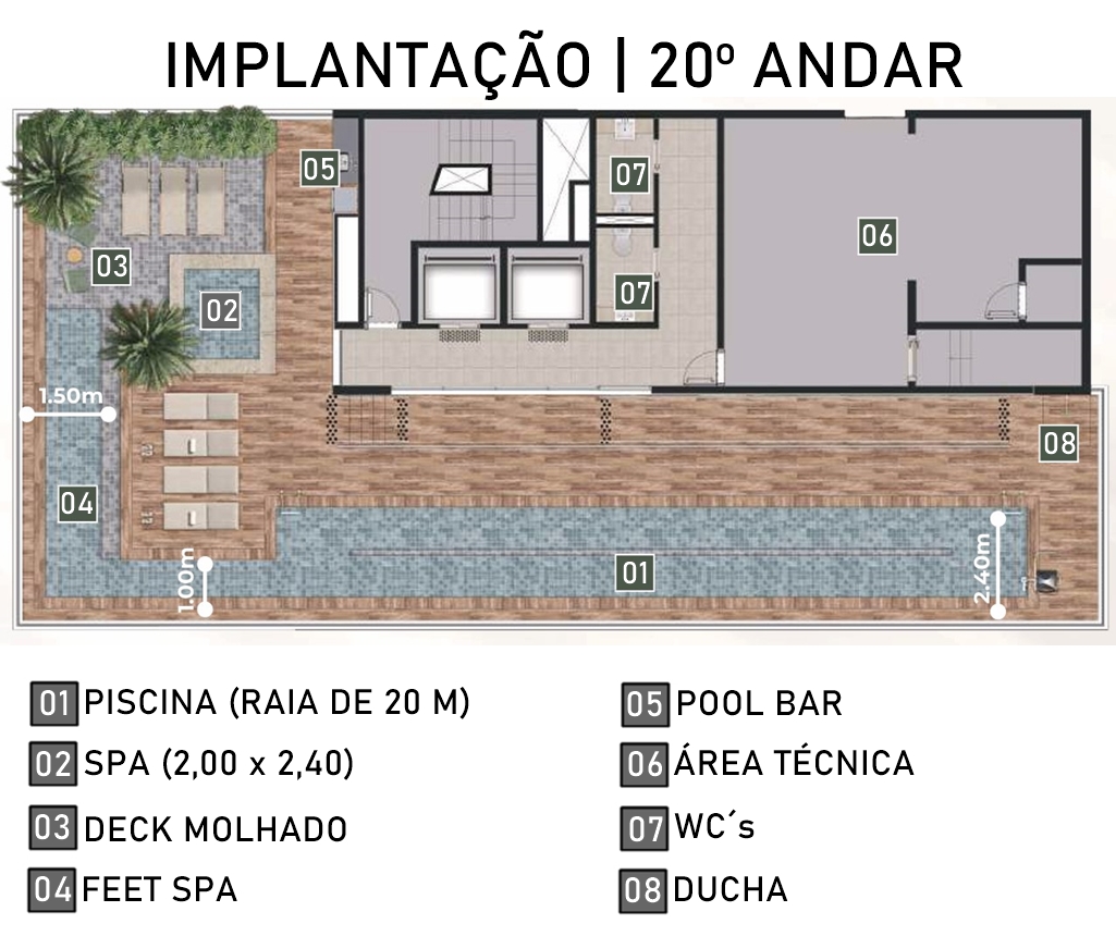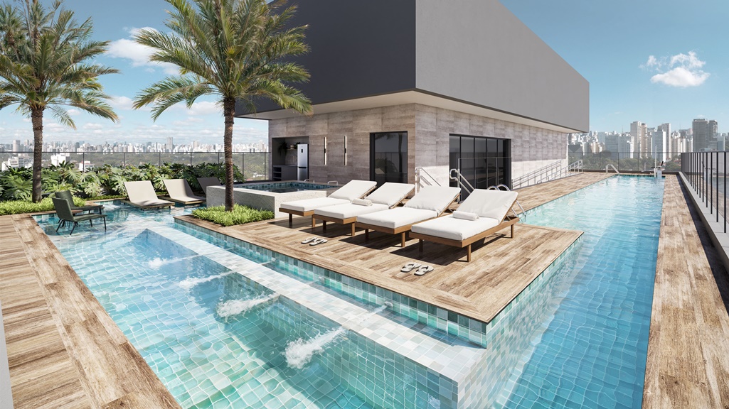 PISCINA NO 20o. ANDAR COM SOLÁRIO E DECK MOLHADO